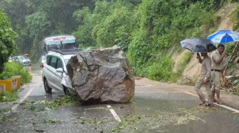 चलती कार के बोनट पर गिरा विशाल बोल्डर